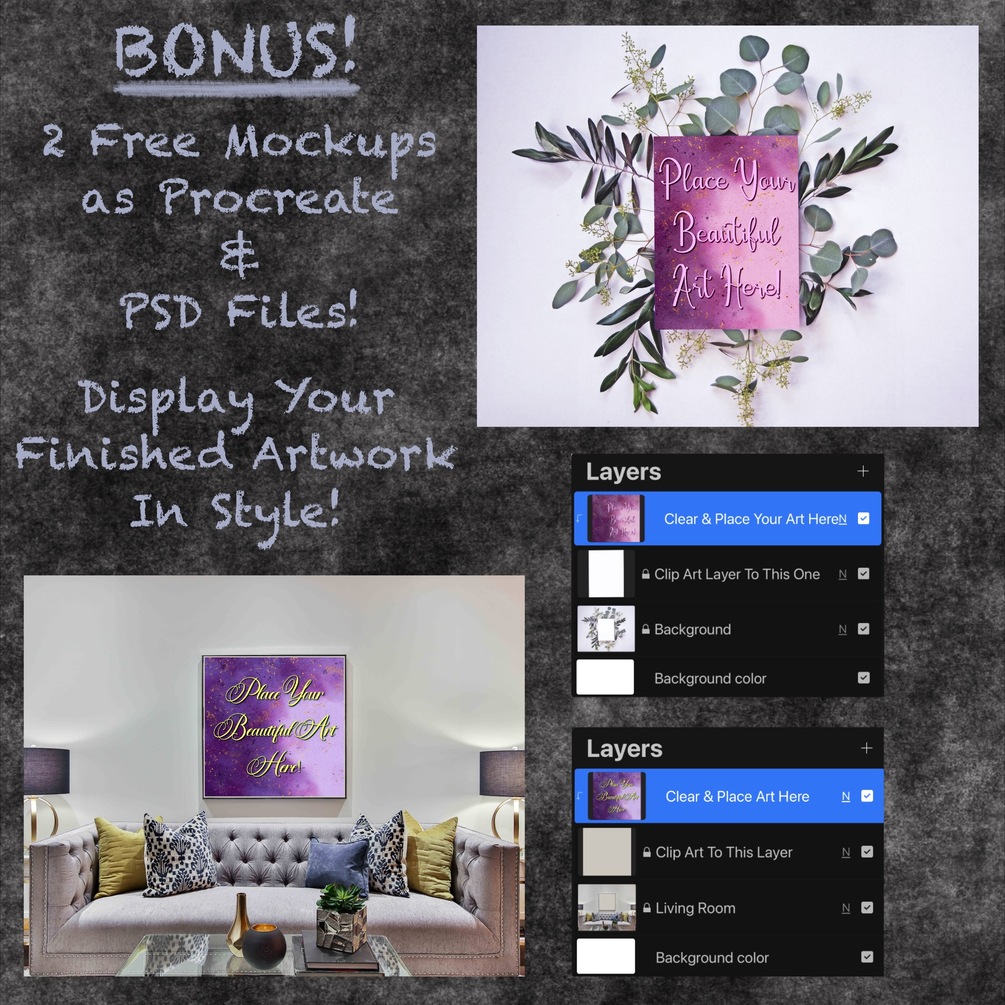 I've provided 2 Mockup 8x10" Canvases in both Procreate & PSD files so you can display your finished art beautifully! These very simple to use and the frame sizes are not editable; one is for square artworks and one is for rectangular artwork. The latter is set up for portrait orientation art, but simply rotating the canvas give you the option to display landscape orientation art as well. The background here works either way!