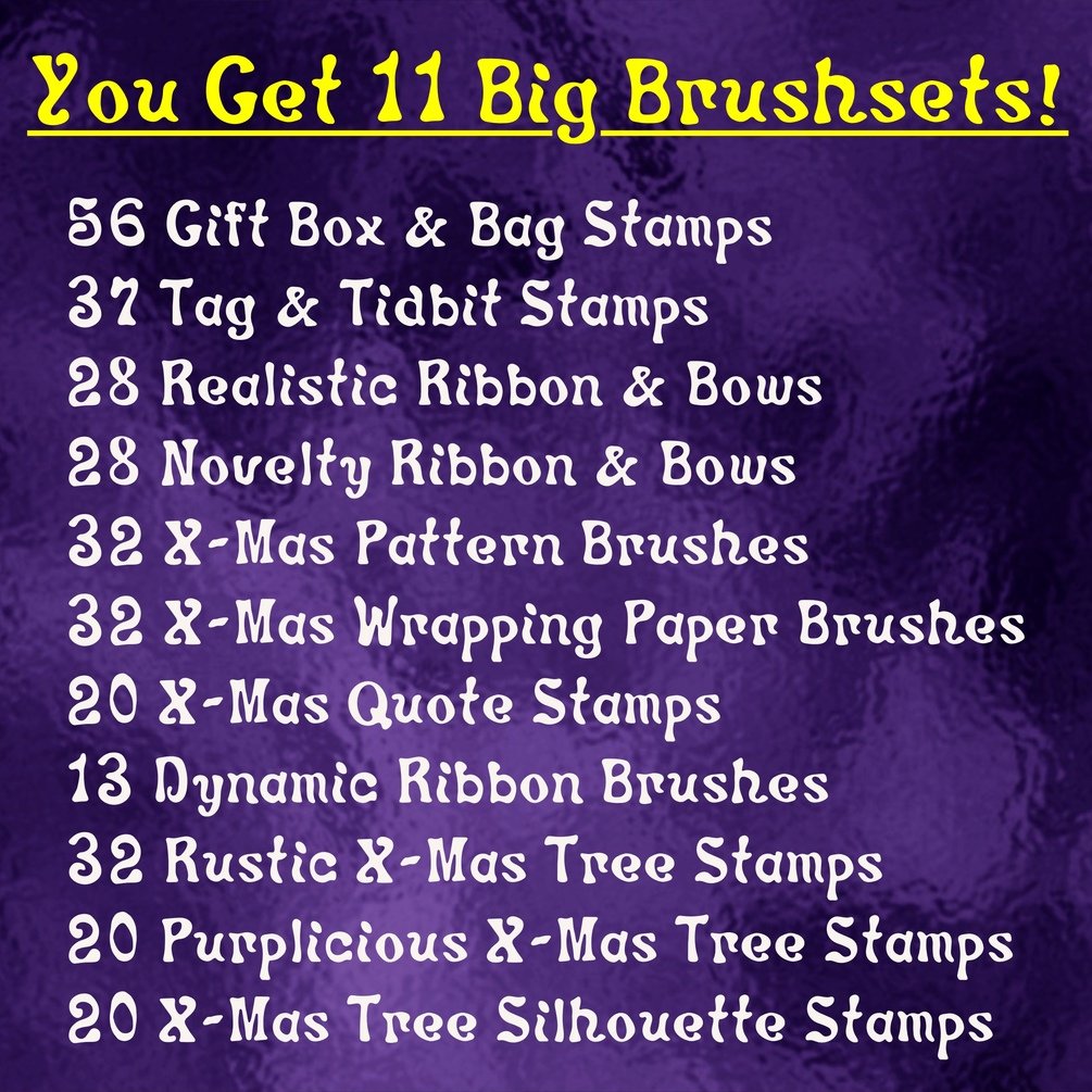 A Total of 11 Brushsets!1 Set of Dynamic Ribbon Brushes 1 Set of Gift Boxes & Bags 1 Set of Tags & Tidbits 2 Sets of Ribbons & Bows (1 Novelty & 1 Realistic) 1 Set of 32 Christmas Pattern Brushes 1 Set of 32 Wrapping Paper Brushes Made From the Same Patterns 1 Set of 20 Christmas Quotes 3 Sets of Christmas Tree Stamps, each a different style ***FREE LIFETIME UPDATES***