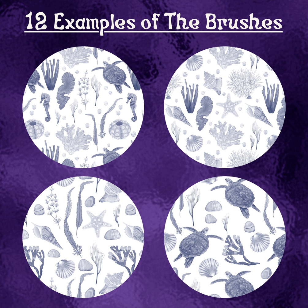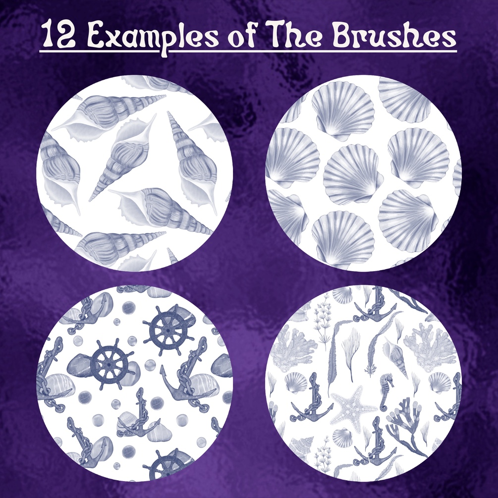 These 18 high quality Gorgeous Marine patterns are great for backgrounds! The pattern sizes are easily adjustable simply by changing the size of the brush, which makes them suitable for applying to smaller objects in your artwork.