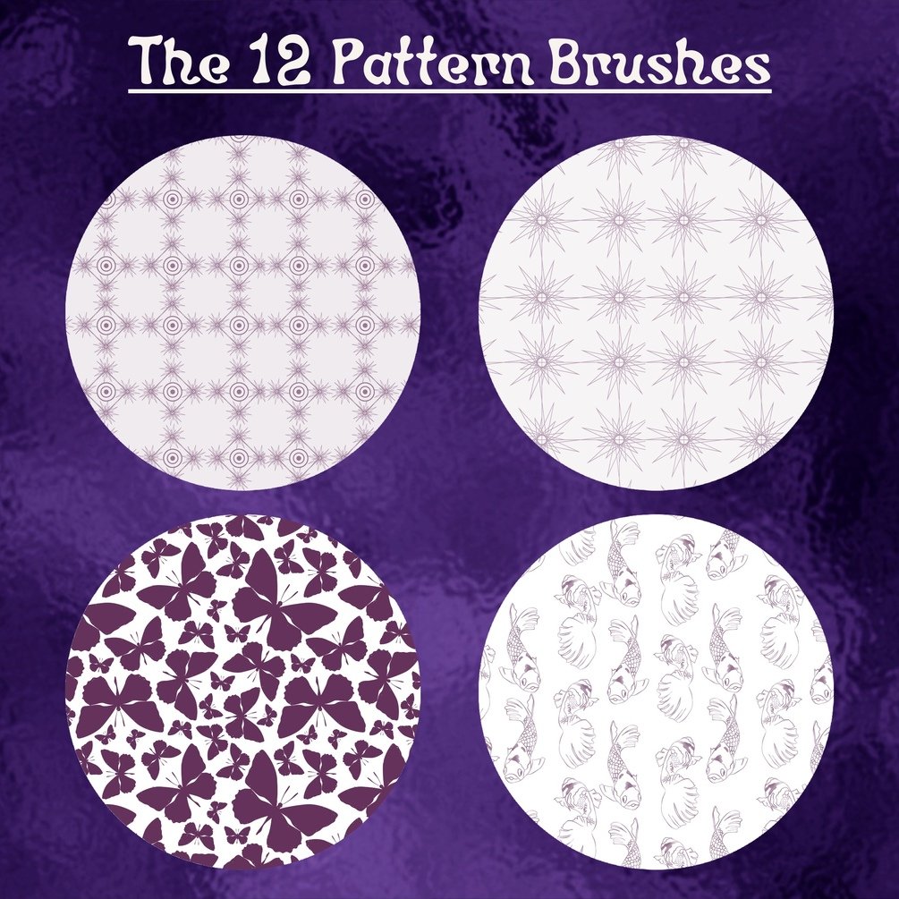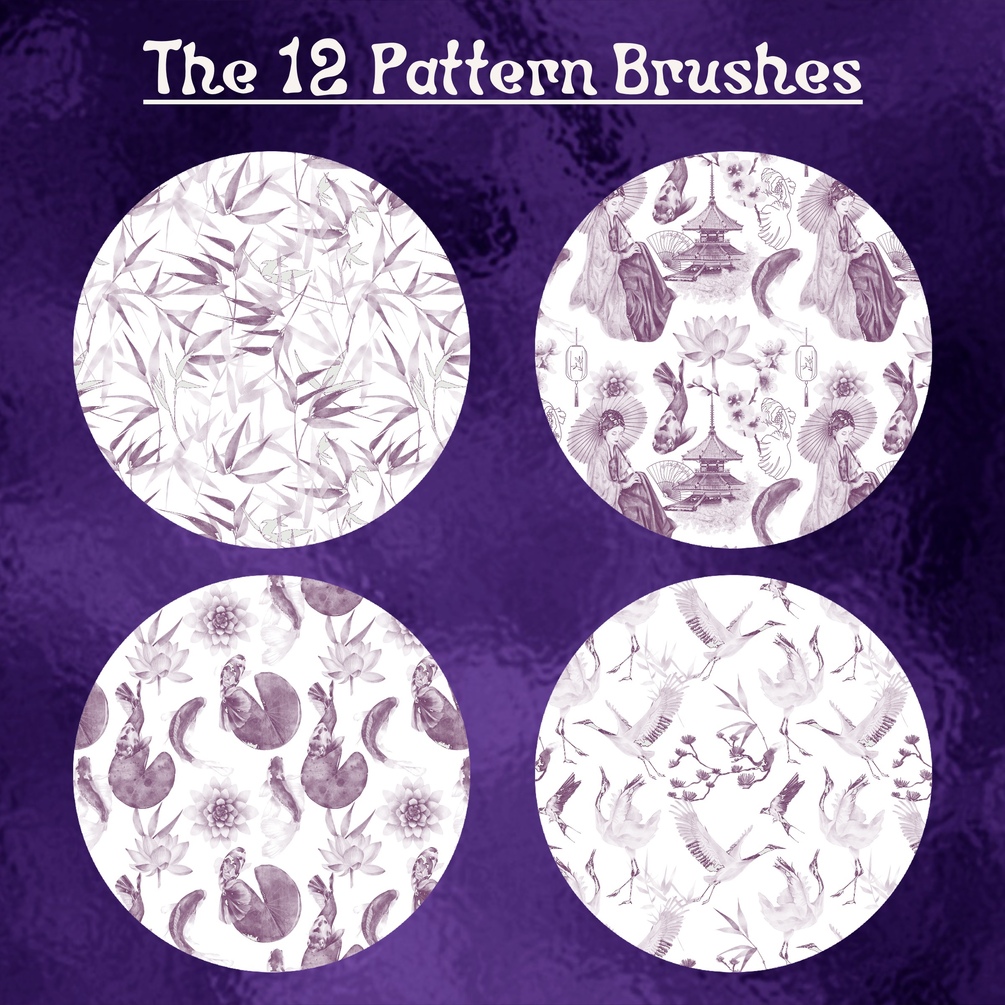 These 12 high quality, elegant Japanese patterns are great for backgrounds! The pattern sizes are easily adjustable simply by changing the size of the brush, which makes them suitable for applying to smaller objects in your artwork.